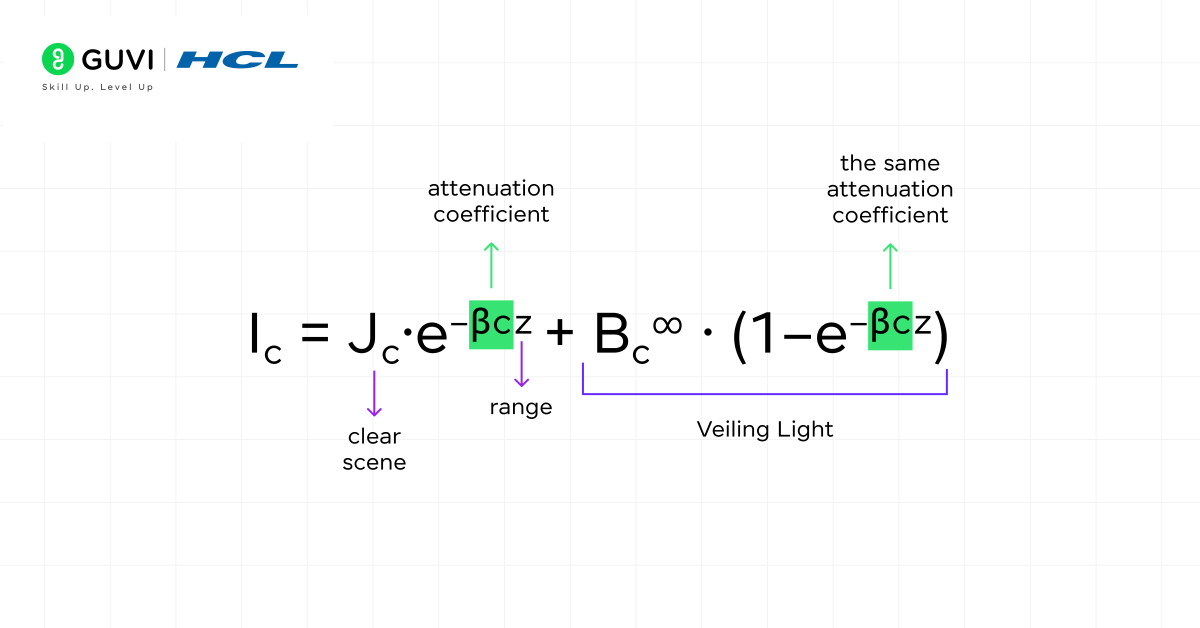 In simpler terms, attenuation refers to the decrease in the amount of light as it travels through water. To correct the distortion caused by this, we need to first calculate the original form of light before it enters the water and then use this information to estimate the attenuation coefficients, which can help us create depth maps. These depth maps can then be used to recover the true colors of the scene.