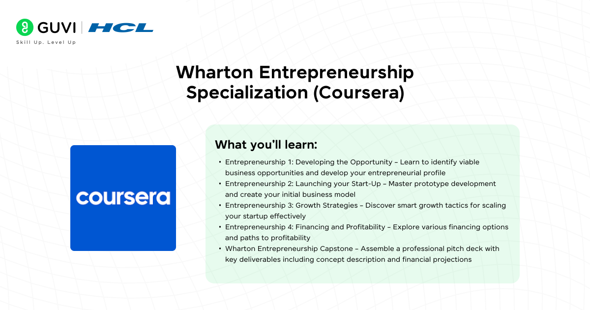 ![Top 6 Entrepreneurship Courses for Budding Business Owners [2025] 4 Wharton Entrepreneurship Specialization Coursera@2x](https://www.guvi.in/blog/wp-content/uploads/2025/07/Wharton-Entrepreneurship-Specialization-Coursera@2x-1200x630.png)