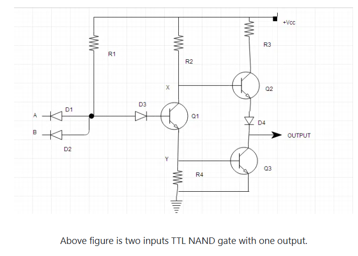Above figure is two inputs TTL NAND gate with one output.
