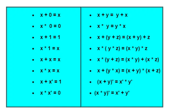 A Boolean Algebra is an algebra(set, operations, elements) consisting of a set B with >=2 elements, together with three operations- the AND operation(Boolean Product), the OR operation(Boolean Sum), and the NOT operation(Complement) - defined on the set, such that for any element a, b, c…. of set B, a*b, a+b and a' are in B.
