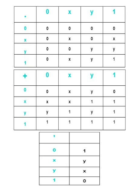 Consider the four-element Boolean algebra B4 = ( {0, x, y, 1}; *, +, '; 0, 1). The AND, OR and NOT operations are described by the following tables: