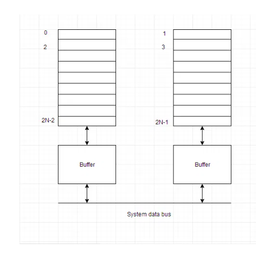 In the interleaved bank representation below with 2 memory banks, the first long word of bank 0 is floowed by that of bank 1, which is followed by the second long word of bank 0, which is followed by the second long word of bank 1 and so on.