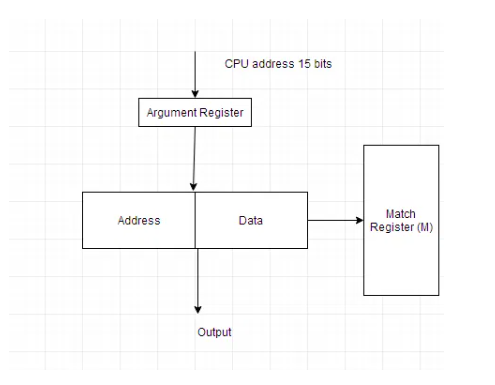 The associative memory stores both address and data. The address value of 15 bits is 5 digit octal numbers and data is of 12 bits word in 4 digit octal number. A CPU address of 15 bits is placed in argument register and the associative memory is searched for matching address.