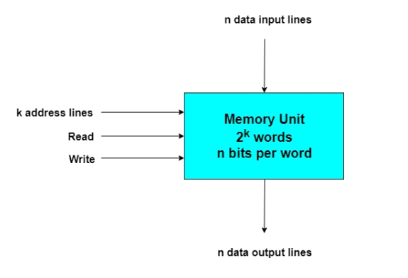 The n data input lines provide the information to be stored in memory, and the n data output lines supply the information coming out of particular word chosen among the 2k available inside the memory. The two control inputs specify the direction of transfer desired.