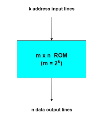 An m x n ROM is an array of binary cells organized into m words of n bits each. As shown in the block diagram below, a ROM has k address input lines to select one of 2k = m words of memory, and n input lines, one for each bit of the word. An integrated circuit ROM may also have one or more enable inputs for expanding a number of packages into a ROM with larger capacity.