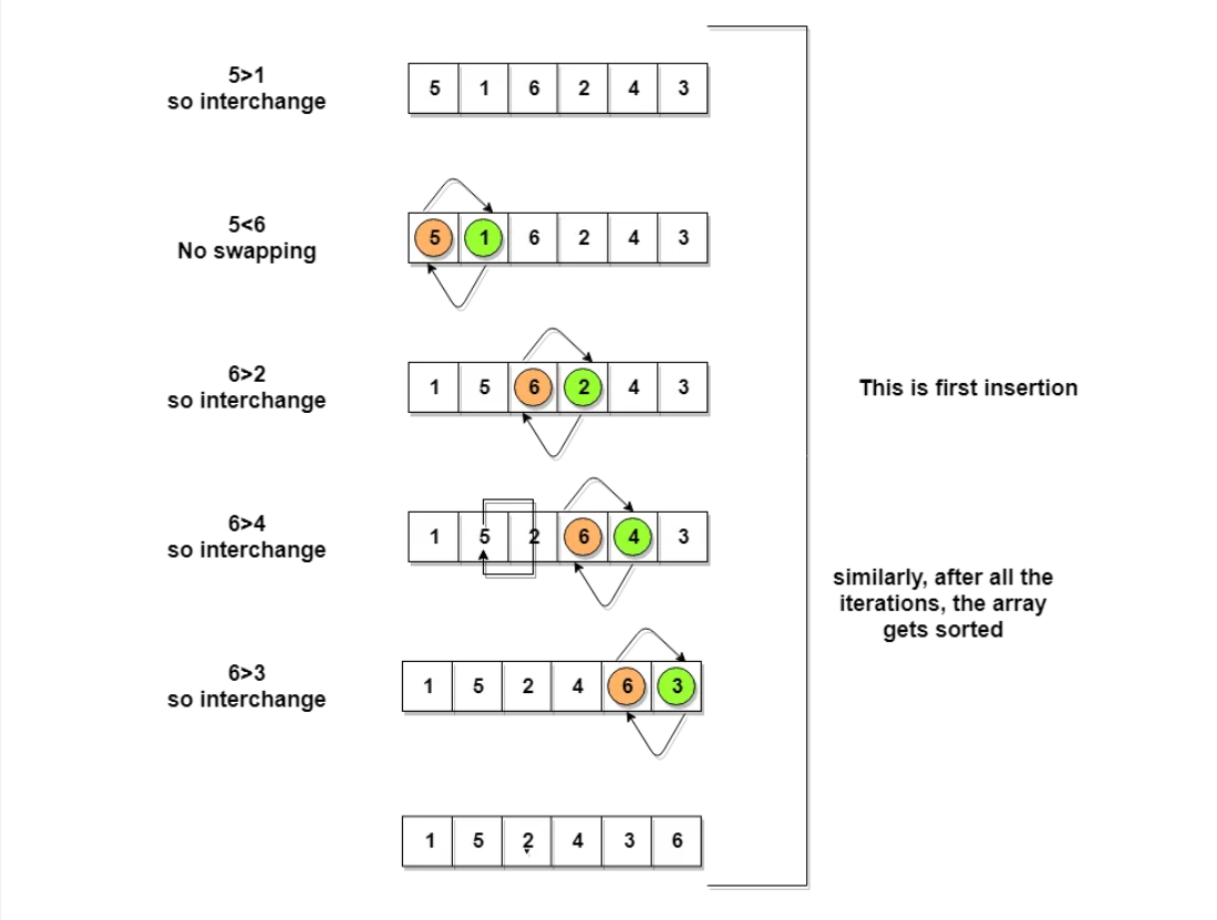 - Starting with the first element(index = 0), compare the current element with the next element of the array.