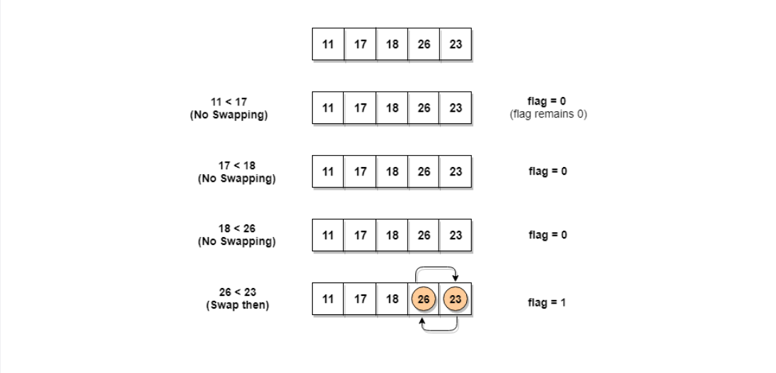 As we can see, in the first iteration, swapping took place, hence we updated our flag value to 1, as a result, the execution enters the for loop again. But in the second iteration, no swapping will occur, hence the value of flag will remain 0, and execution will break out of loop.