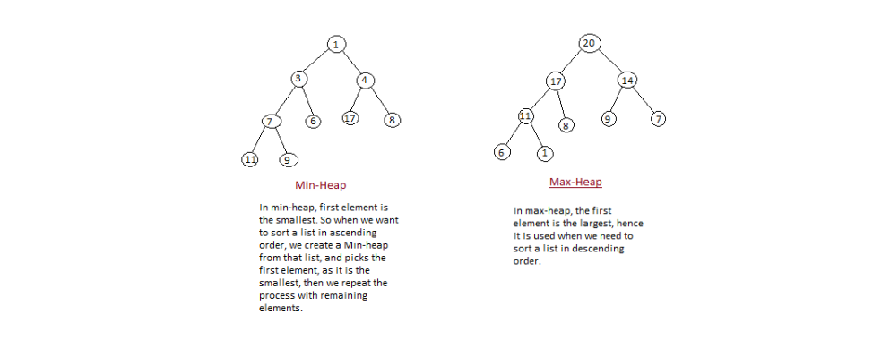 Heap Property: All nodes are either greater than or equal to or less than or equal to each of its children. If the parent nodes are greater than their child nodes, heap is called a Max-Heap, and if the parent nodes are smaller than their child nodes, heap is called Min-Heap.