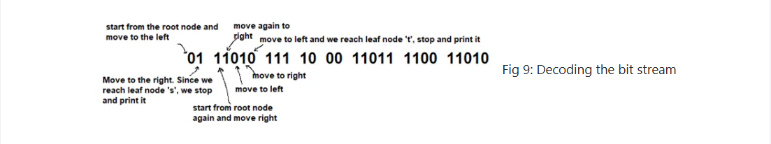 Once received at the receiver’s side, it will be decoded back by traversing the Huffman tree. For decoding each character, we start traversing the tree from root node. Start with the first bit in the string. A ‘1’ or ‘0’ in the bit stream will determine whether to go left or right in the tree. Print the character, if we reach a leaf node.
