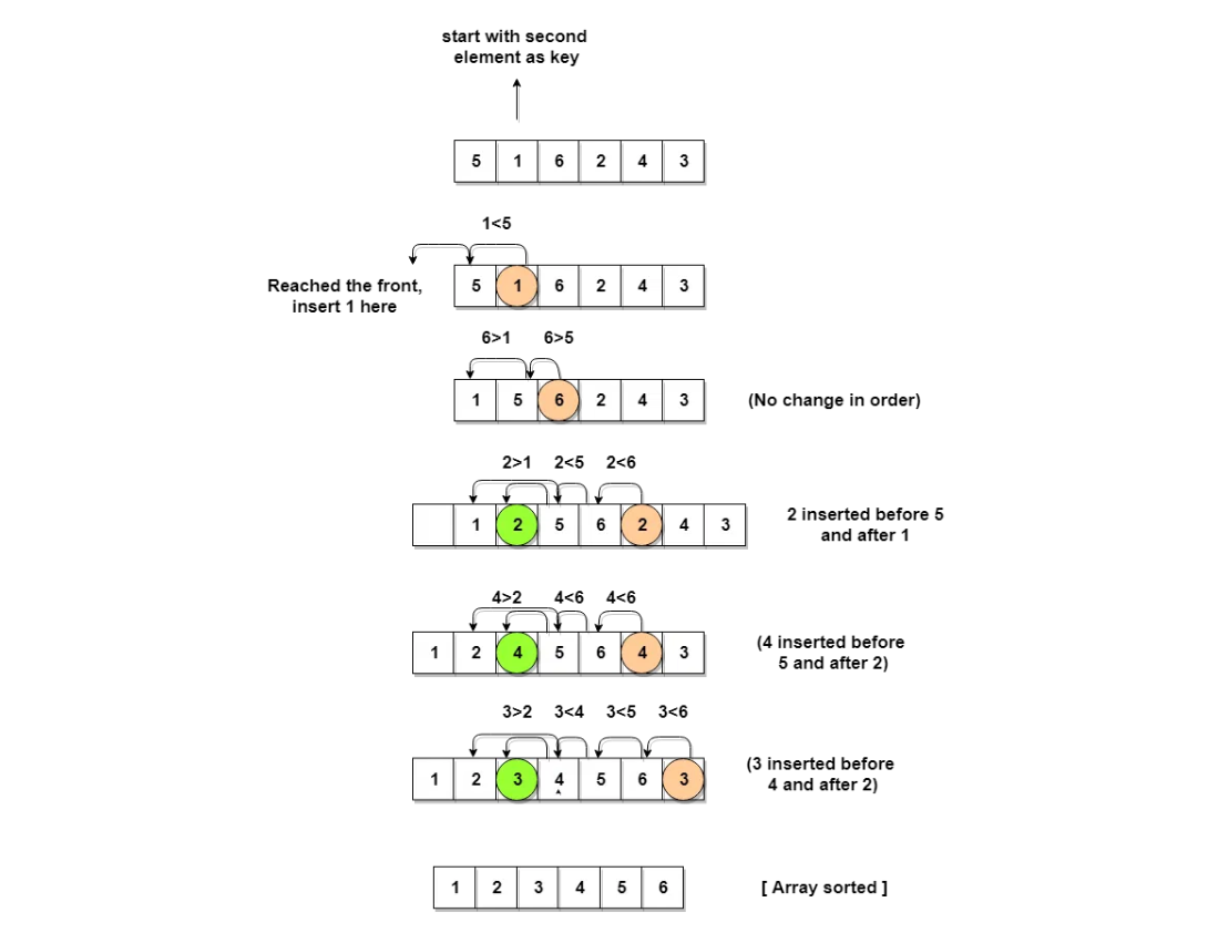 keyand will compare it with elements to it's left and insert it at the right position. - And we go on repeating this, until the array is sorted.