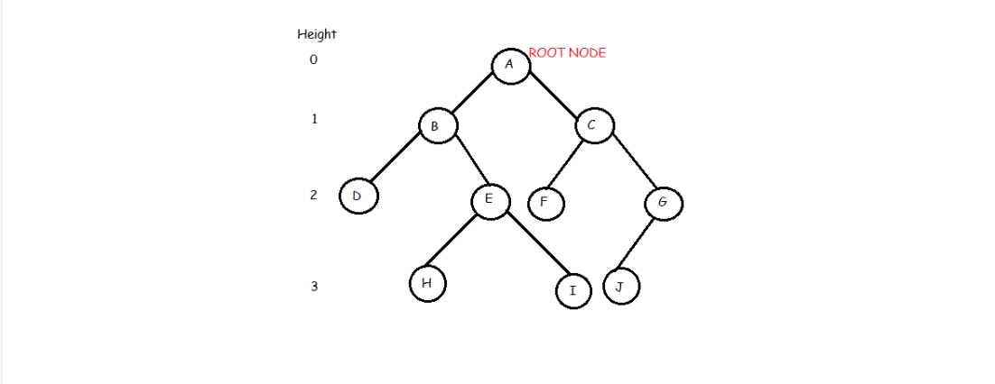 In the above binary tree we see that root node is A. The tree has 10 nodes with 5 internal nodes, i.e, A,B,C,E,G and 5 external nodes, i.e, D,F,H,I,J. The height of the tree is 3. B is the parent of D and E while D and E are children of B.