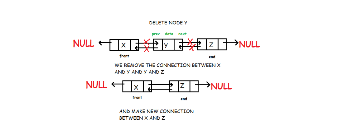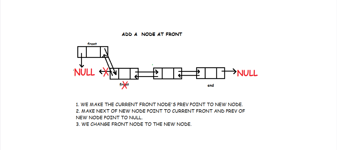 Let’s say we are inserting node X before Y. Then X’s next pointer will point to Y and X’s prev pointer will point the node Y’s prev pointer is pointing. And Y’s prev pointer will now point to X. We need to make sure that if Y is the first node of list then after adding X we make front point to X.