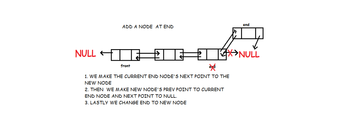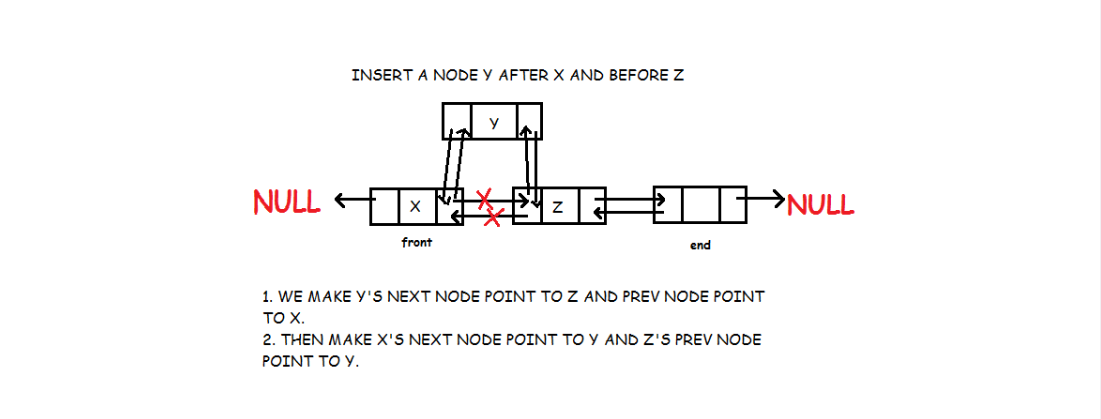 Let’s say we are inserting node Y after X. Then Y’s prev pointer will point to X and Y’s next pointer will point the node X’s next pointer is pointing. And X’s next pointer will now point to Y. We need to make sure that if X is the last node of list then after adding Y we make end point to Y.