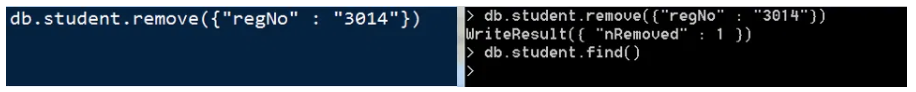 db.collection_name.remove({"fieldname":"value"})For Example: db.student.remove({"regNo":"3014"})