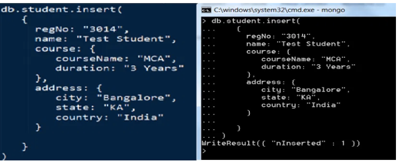 Let us insert a document to a student collection. You must be connected to a database for doing any insert. It is done as follows: