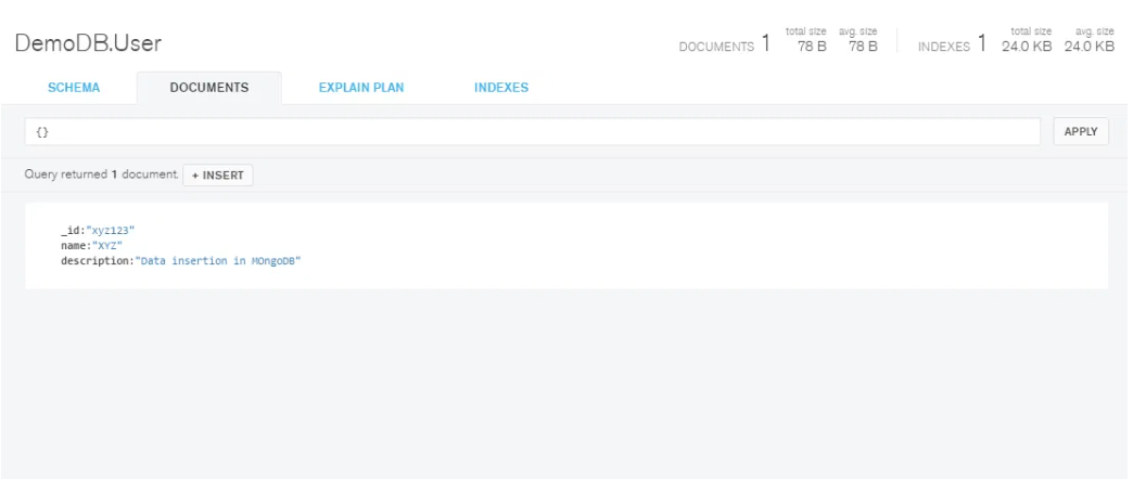 We will continue with our collection User for data insertion which we created after connecting with MongoDB database. Let us consider various scenarios for inserting data in our collection User.