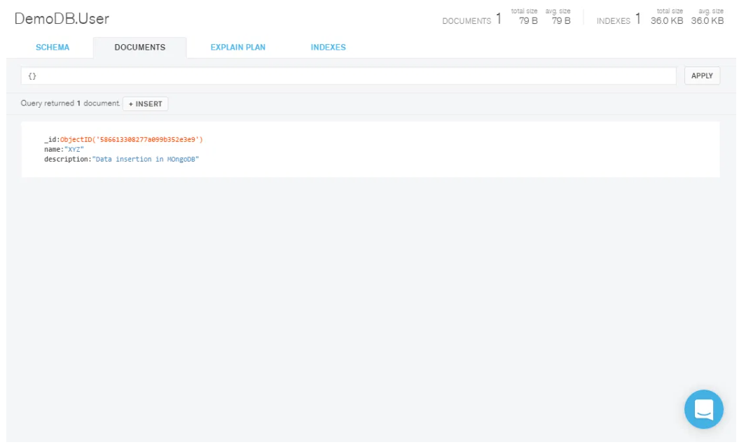 Suppose, we want to create a document in our User collection with fields name and description, we will make use of following code snippet: