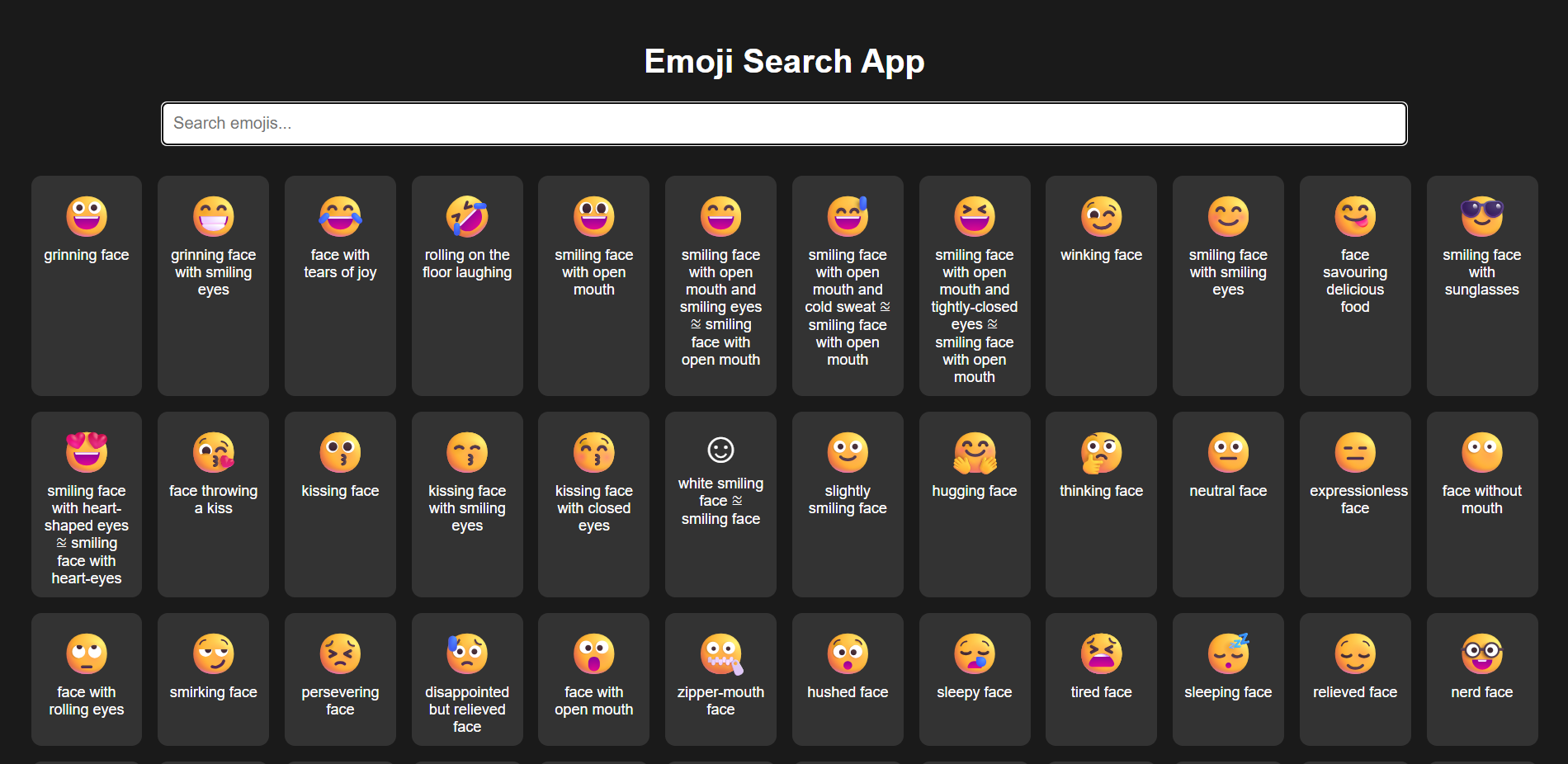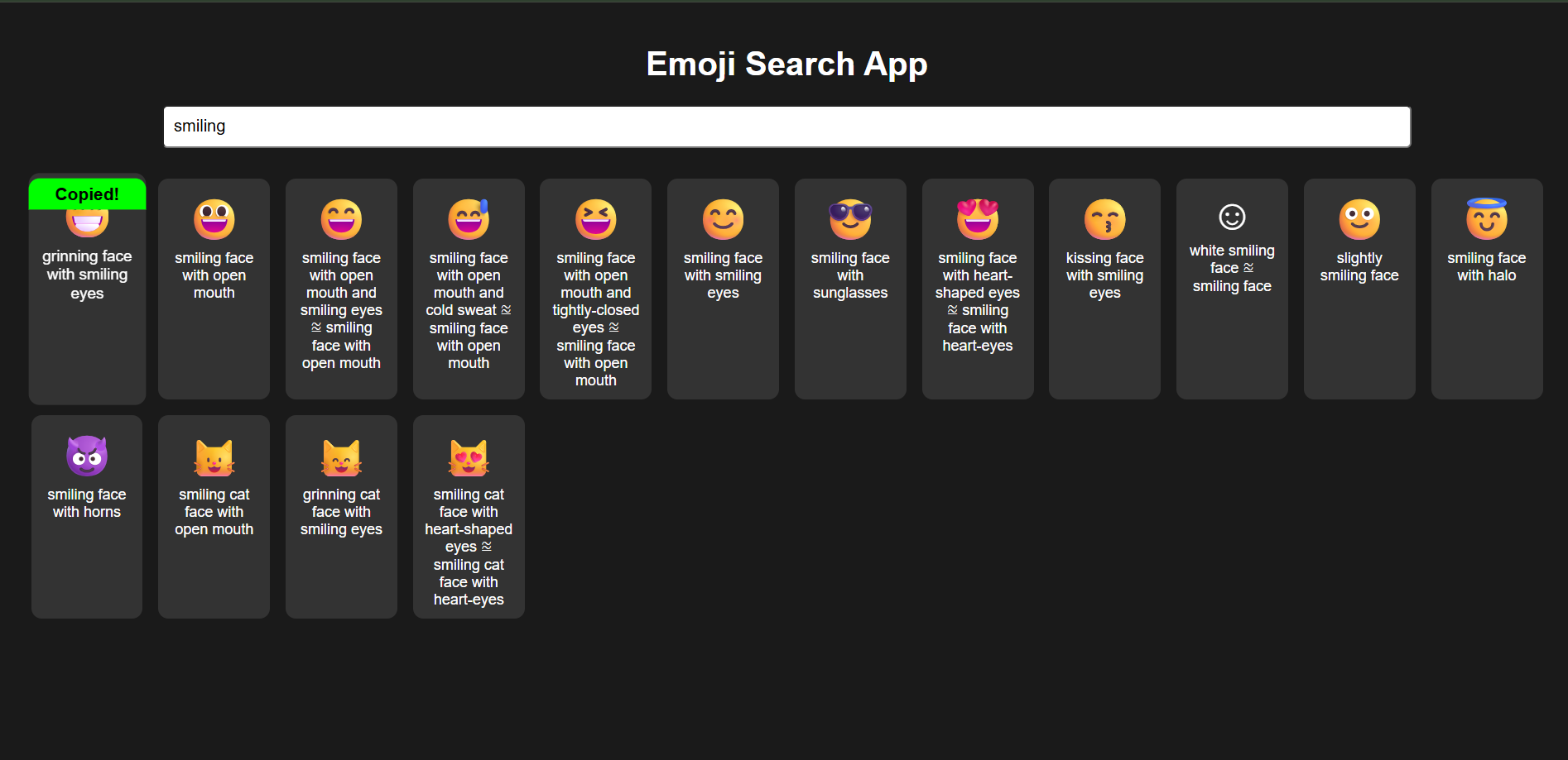 The output of the app is a list of matching emojis displayed on the page. Once the app fetches the emoji data from the API, it will filter that data based on the search input and render the filtered emojis. Each emoji is shown as a card (with the emoji graphic and name). Additionally, when a user clicks an emoji card, the app copies that emoji to the clipboard and shows a “Copied!” message. In short, given a text query input, the app outputs (renders) the corresponding emojis that match the search.