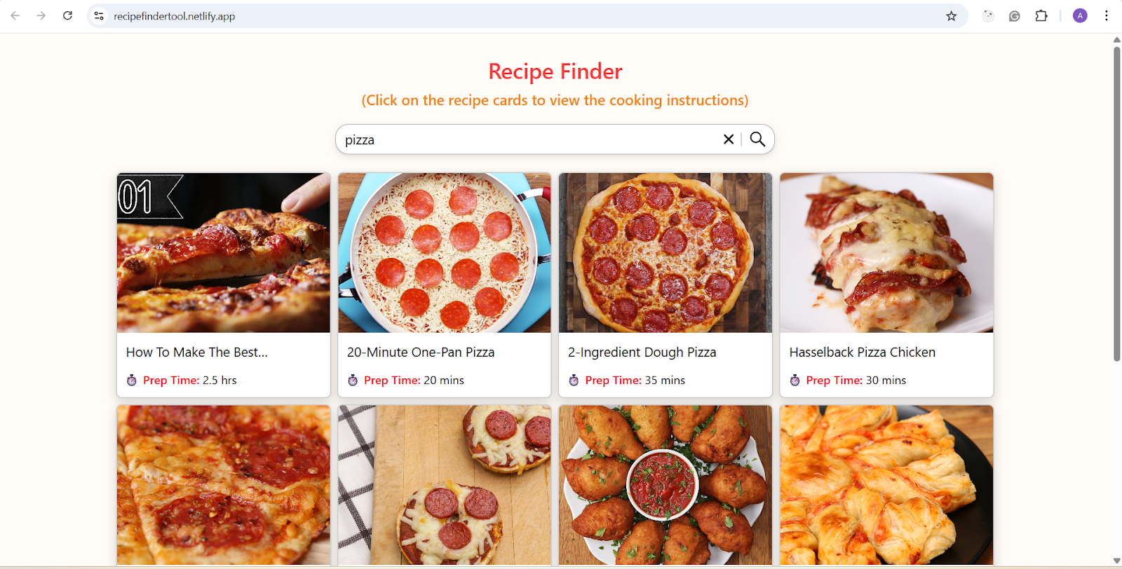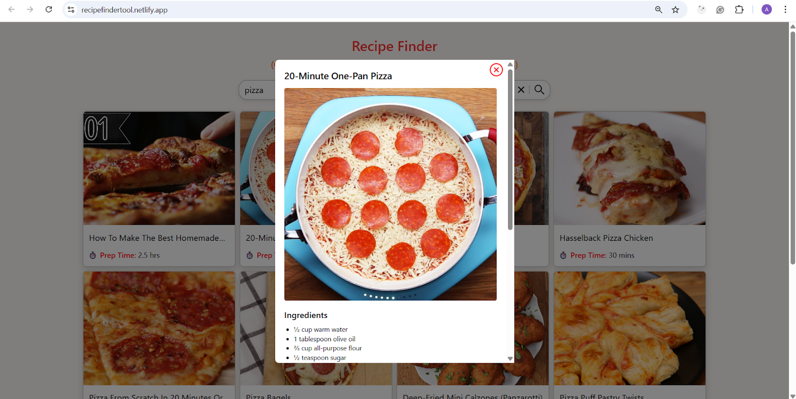 The application shows a grid of recipe cards based on the search results, and selecting any card opens a modal with ingredients and cooking instructions, as displayed on the screen.