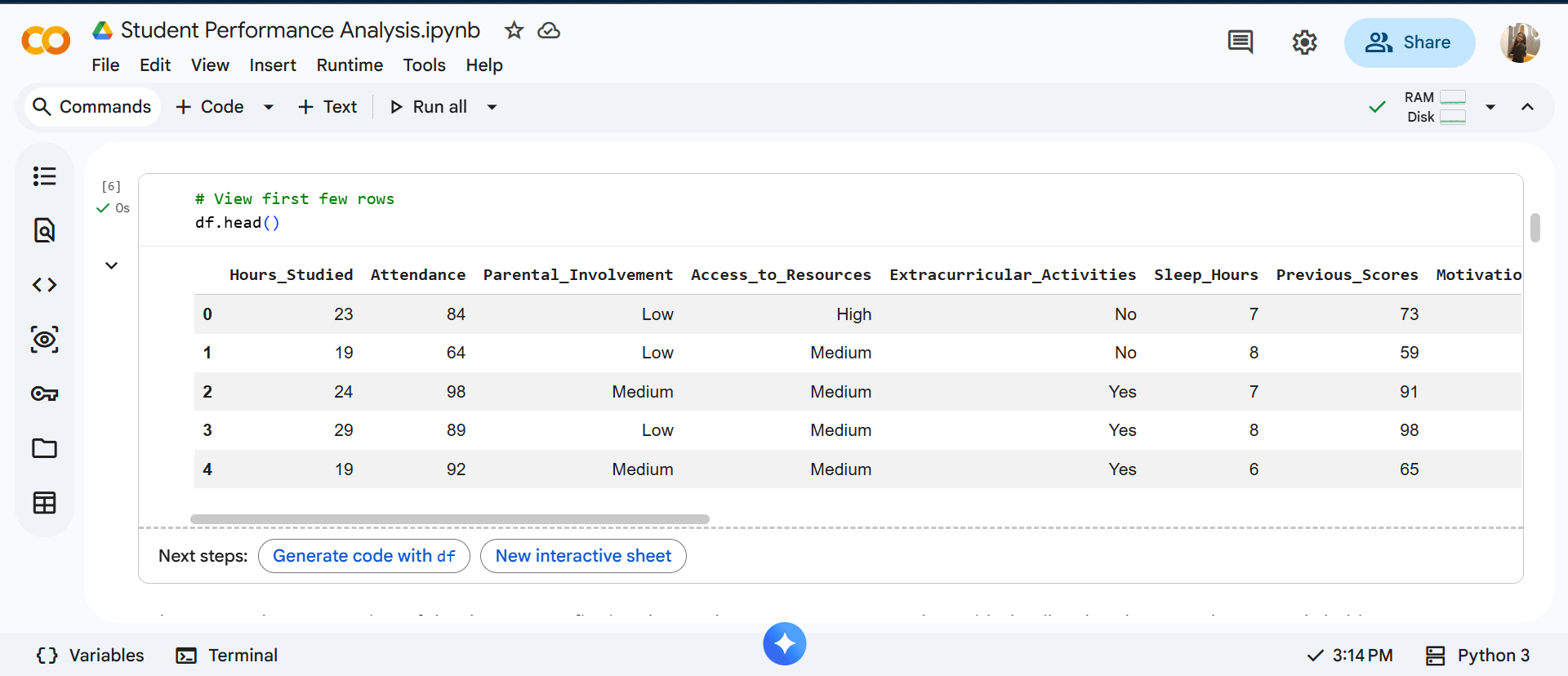 This output shows a snapshot of student records, including various performance-related factors and exam scores. Each row represents an individual student’s data.