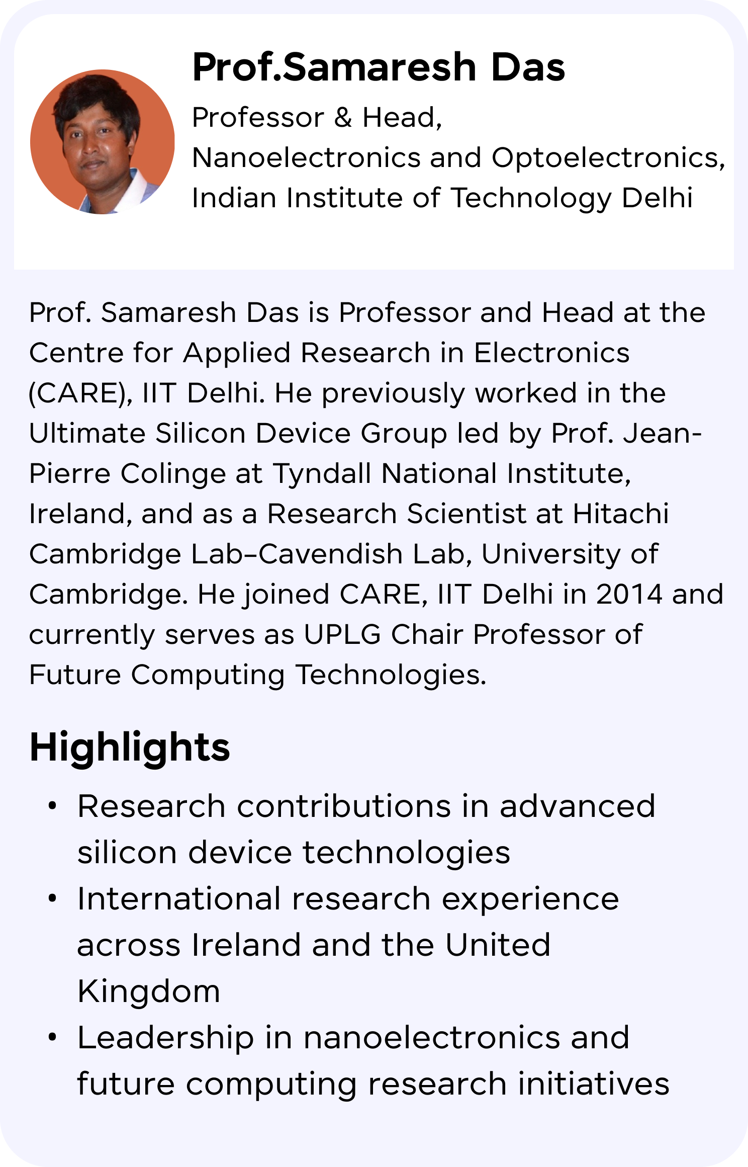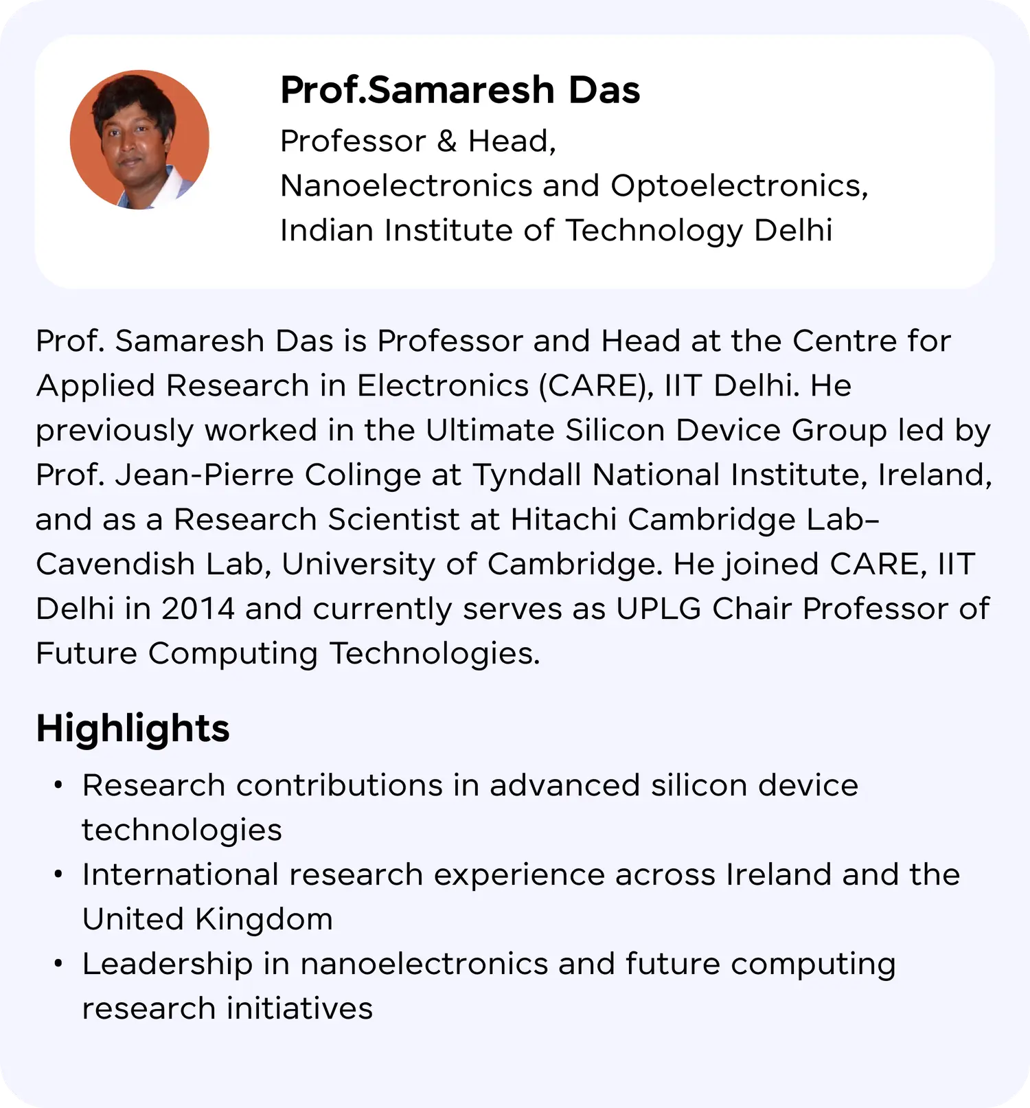 Prof. Samaresh Das is Professor and Head at the Centre for Applied Research in Electronics (CARE), IIT Delhi. He previously worked in the Ultimate Silicon Device Group led by Prof. Jean-Pierre Colinge at Tyndall National Institute, Ireland, and as a Research Scientist at Hitachi Cambridge Lab–Cavendish Lab, University of Cambridge. He joined CARE, IIT Delhi in 2014 and currently serves as UPLG Chair Professor of Future Computing Technologies.