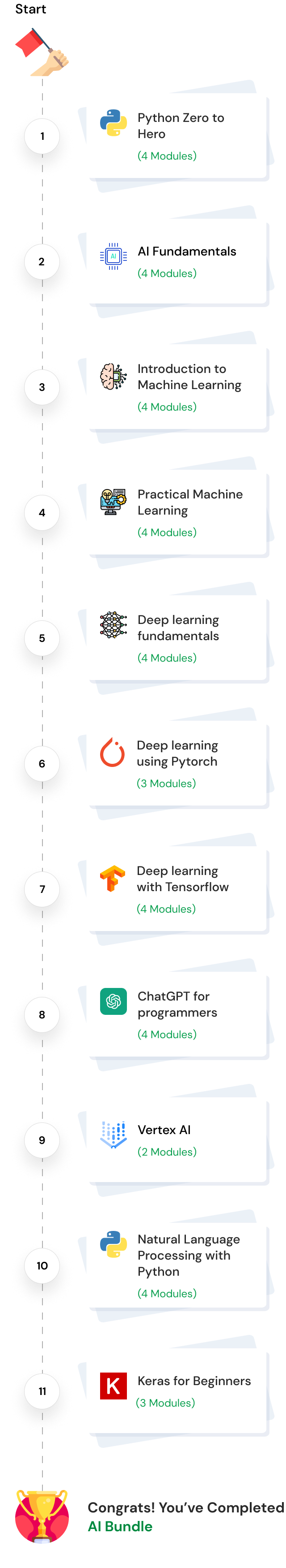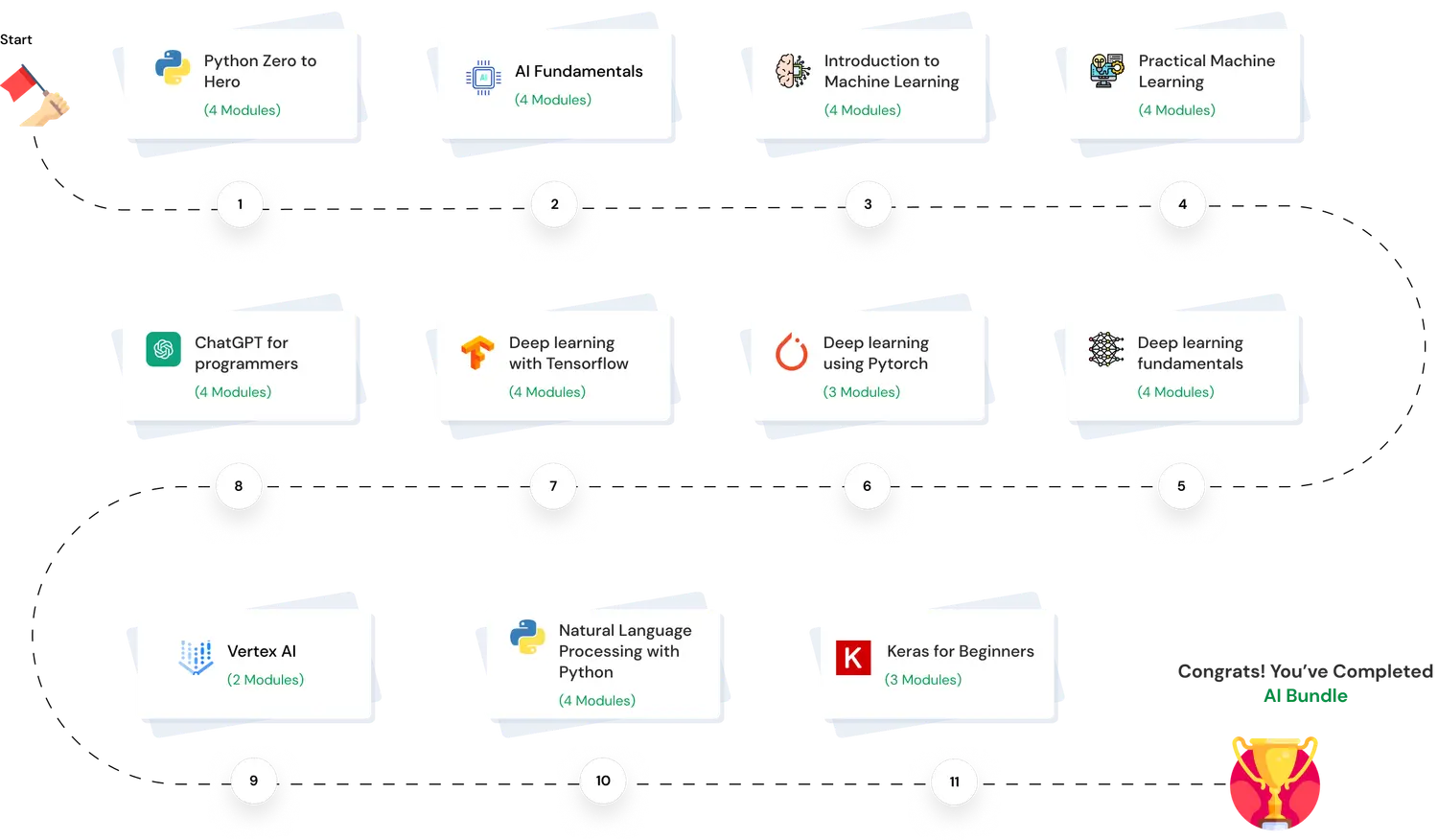 AI is a vast domain that involves a lot of sections and specializations. With GUVI’s AI bundle, you can begin your AI learning journey and finish it at your own pace, ensuring better and more targeted learning. One can easily finish the entire bundle within a month. However, it would take good practice in each module over months to build a solid foundation in AI.
